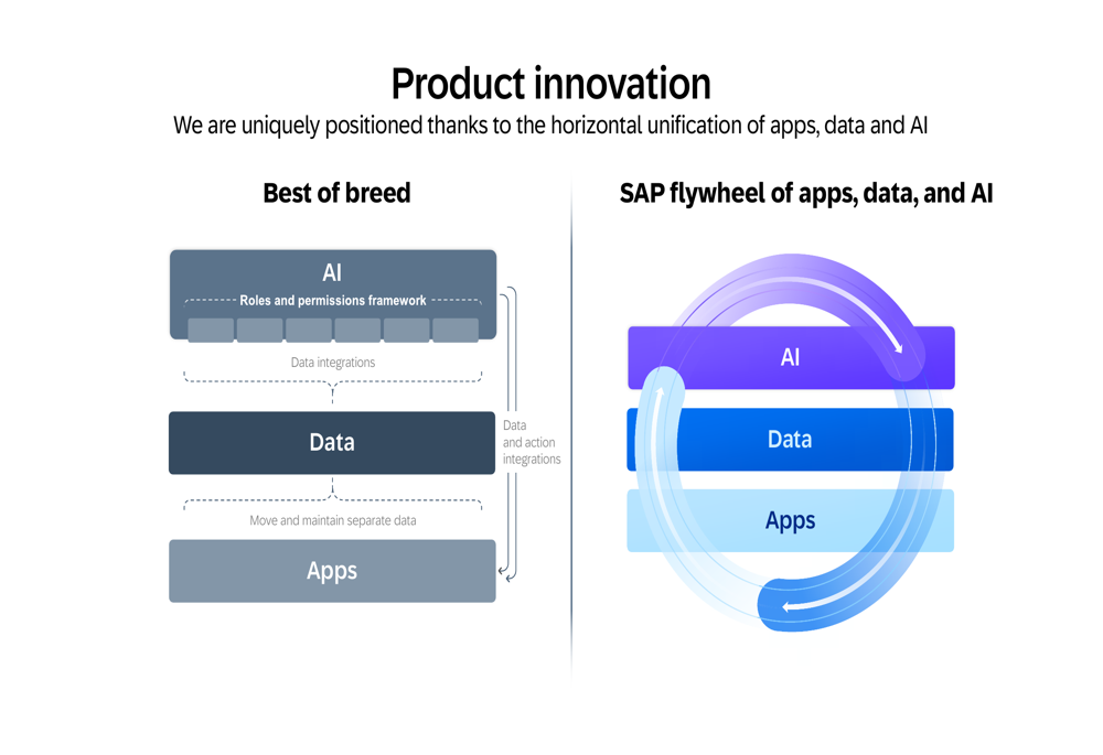 The company contrasted its approach with the traditional "best of breed" model, illustrating how SAP’s integrated approach creates a "flywheel" effect: