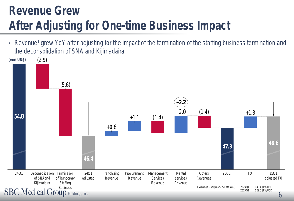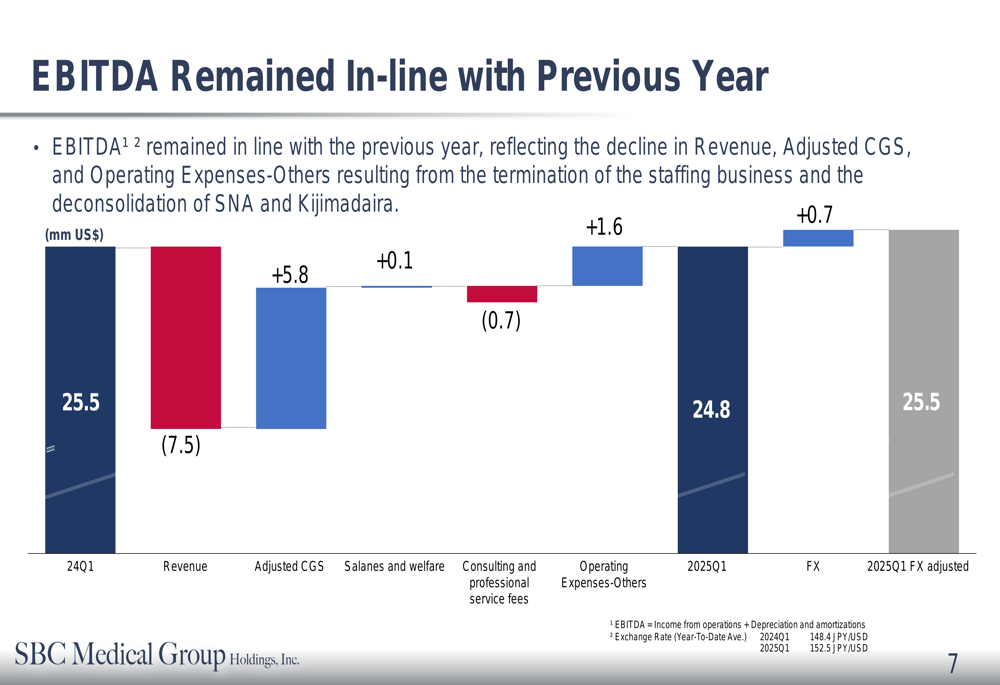 SBC Medical reported total consolidated revenue of $47 million for Q1 2025, representing a 14% year-over-year decline. However, the company emphasized that this decrease was largely attributable to the deconsolidation of SNA and Kijimadaira operations and the termination of its temporary staffing business.