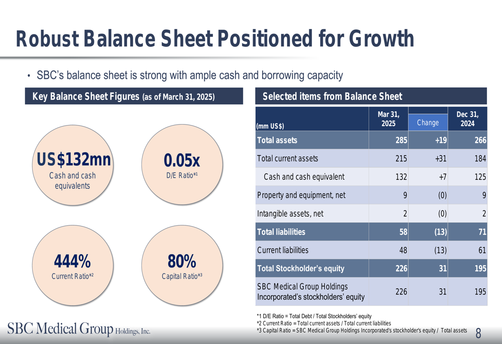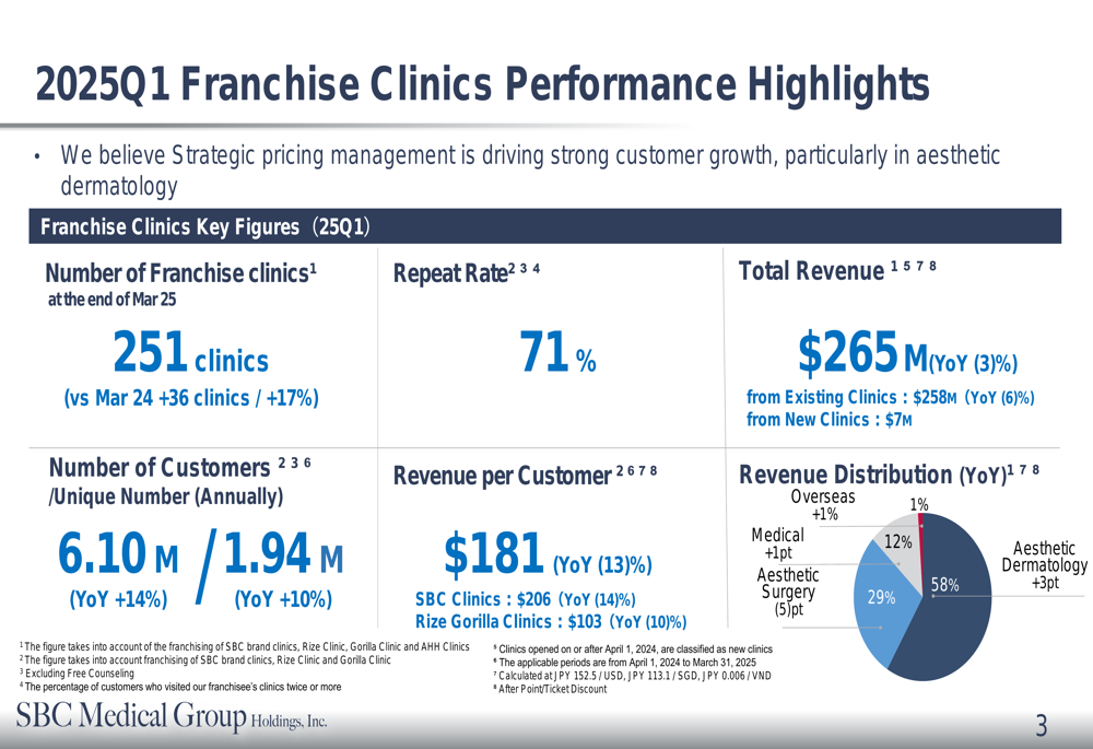 On the operational front, SBC Medical continued to expand its franchise clinic network, which grew to 251 locations, representing a 17% increase (36 additional clinics) compared to March 2024. The company served 6.10 million customers (up 14% year-over-year) with 1.94 million unique customers (up 10%). The customer repeat rate stood at a healthy 71%, though revenue per customer declined by 13% to $181.