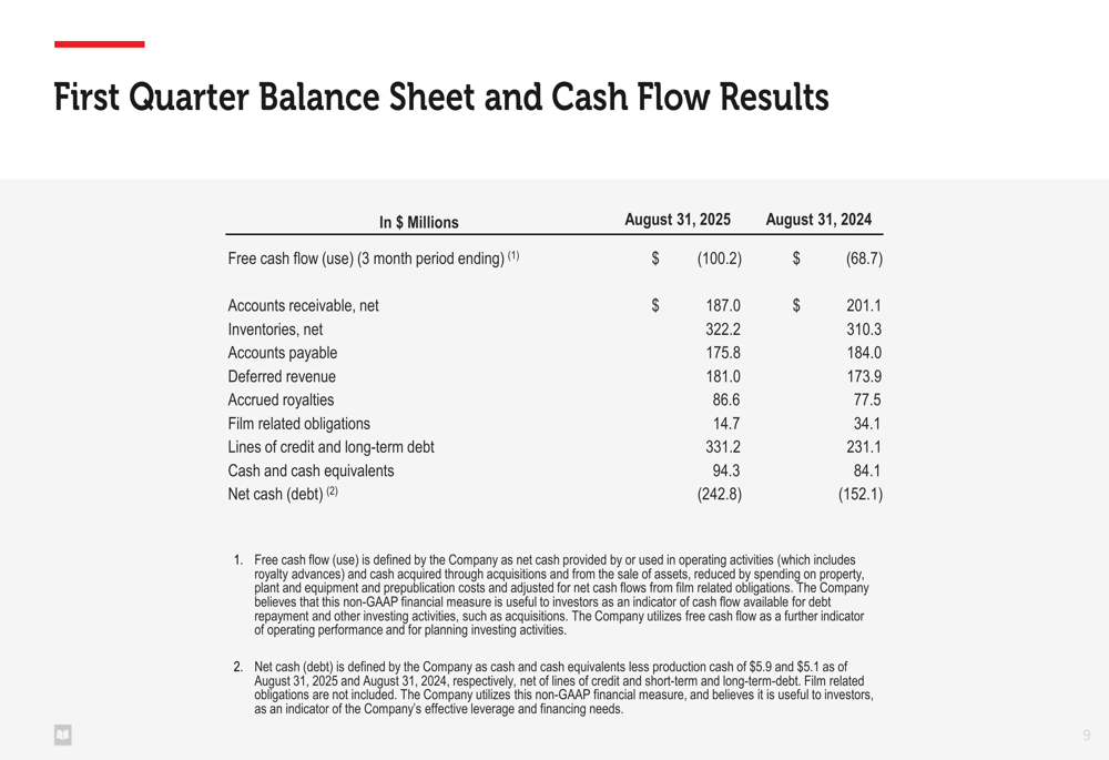 Scholastic’s balance sheet showed some concerning trends, particularly regarding cash flow and debt levels. Free cash flow usage increased to $(100.2) million compared to $(68.7) million in the prior-year period. Net debt position worsened significantly to $(242.8) million from $(152.1) million a year earlier, reflecting increased borrowing and ongoing operational cash needs during the seasonally weak quarter.