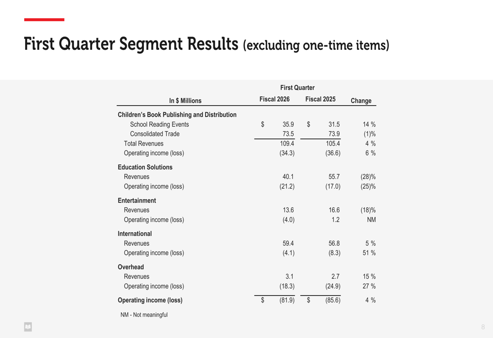 Scholastic reported first quarter revenues of $225.6 million, down 5% from $237.2 million in the same period last year. The company posted an operating loss of $92.2 million, slightly worse than the $88.5 million loss recorded in Q1 2025. However, adjusted EBITDA improved by 8% to $(55.7) million from $(60.5) million in the prior year, suggesting progress in the company’s cost control initiatives.