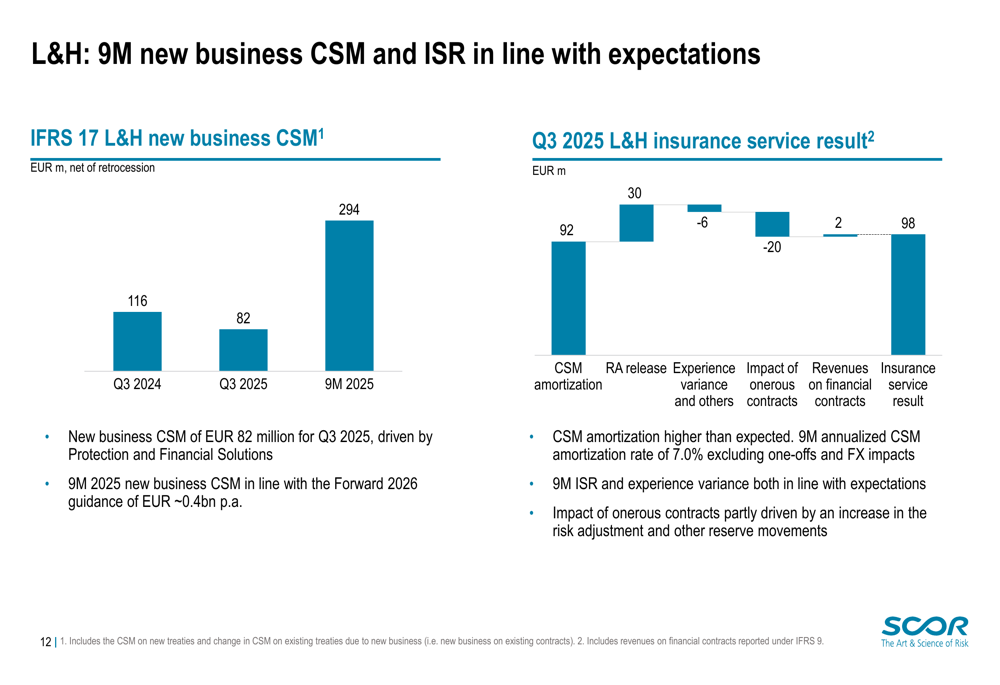 New business CSM in the L&H segment amounted to €82 million for Q3 2025, driven by Protection and Financial Solutions. While this represents a 29% decrease compared to Q3 2024, the nine-month new business CSM of €294 million remains in line with SCOR's Forward 2026 guidance of approximately €400 million per annum.