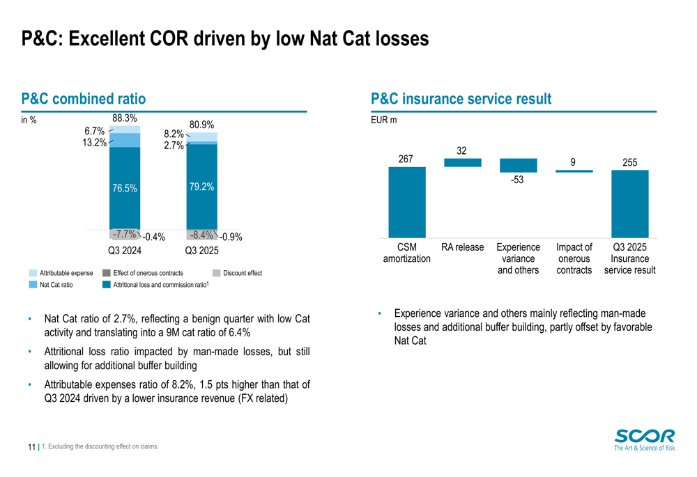 SCOR's P&C business delivered exceptional results in Q3 2025, with a combined ratio of 80.9%, a significant improvement from 88.3% in Q3 2024. This improvement was largely driven by a benign natural catastrophe environment, with the nat cat ratio dropping to just 2.7% from 13.2% in the same period last year.