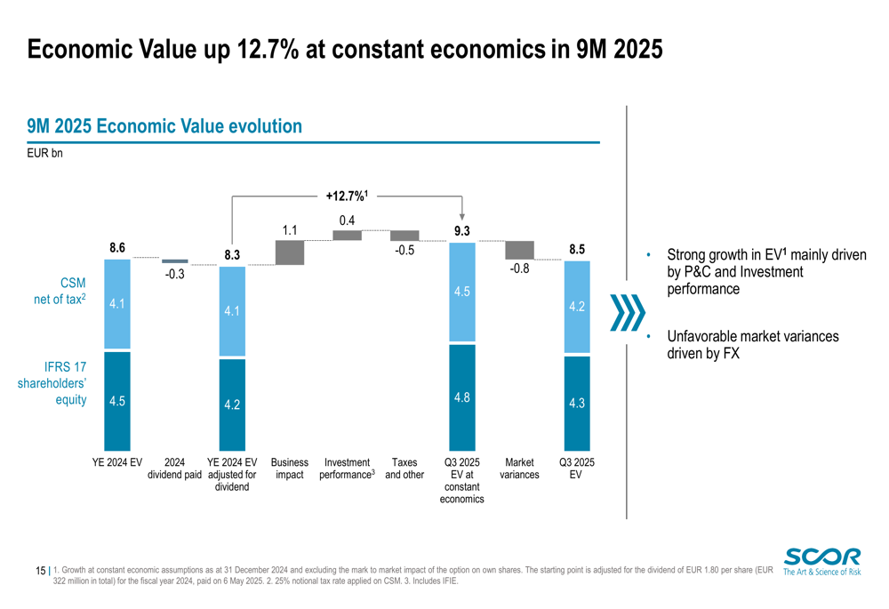 SCOR's economic value grew by 12.7% at constant economics in the first nine months of 2025, reaching €8.5 billion. This growth was primarily driven by strong P&C and investment performance, partially offset by unfavorable foreign exchange effects.