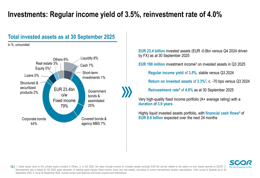 SCOR maintained a solid investment performance in Q3 2025, with a return on invested assets of 3.3% and a regular income yield of 3.5%. The company's investment portfolio remains high-quality and liquid, with an average rating of A+ and a duration of 3.9 years.