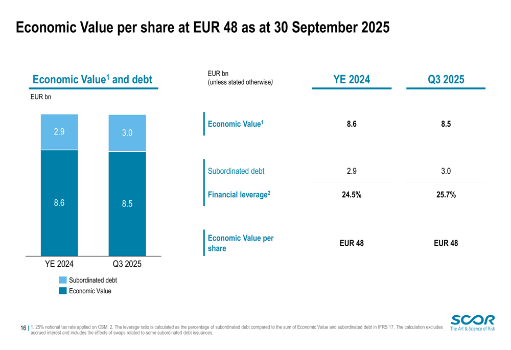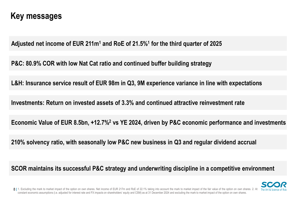 SCOR reported an adjusted net income of €211 million for Q3 2025, translating to an adjusted return on equity of 21.5%. This strong performance contributed to a nine-month adjusted net income of €631 million and a nine-month adjusted return on equity of 19.5%.