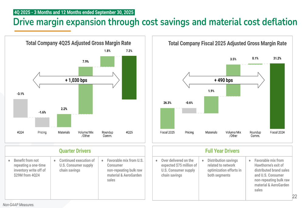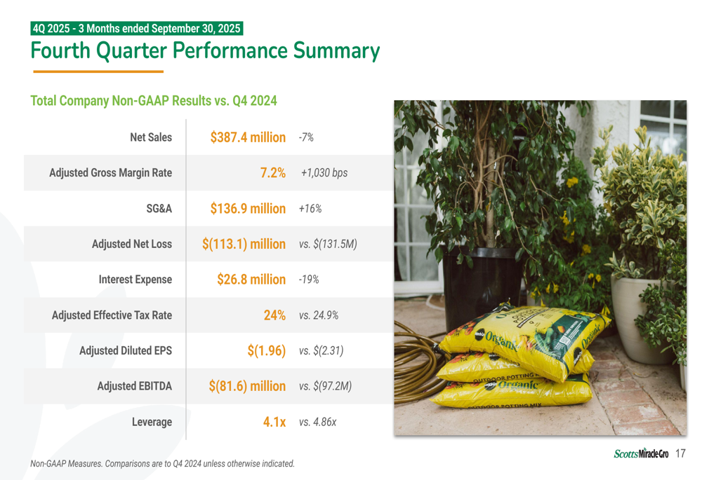 For the full fiscal year 2025, Scotts Miracle-Gro reported net sales of $3.41 billion, representing a 4% decrease from fiscal 2024. However, the company achieved substantial improvements in profitability metrics, with adjusted gross margin expanding by 490 basis points to 31.2%.
