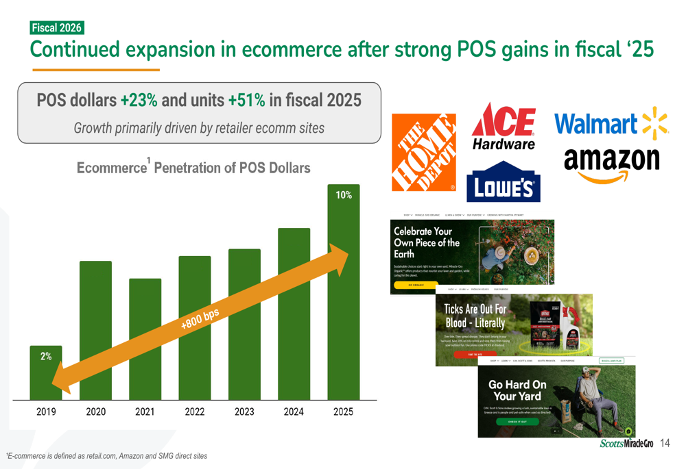E-commerce expansion represents a significant growth opportunity for Scotts Miracle-Gro. In fiscal 2025, the company achieved 23% growth in e-commerce POS dollars and 51% growth in units. E-commerce penetration has increased dramatically from just 2% in 2019 to 10% in 2025.