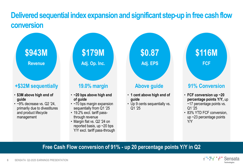 Sensata reported Q2 2025 revenue of $943 million, representing a 9% year-over-year decline but a $32 million sequential improvement from Q1. The company exceeded expectations across its key financial metrics, with adjusted operating income of $179 million (19.0% margin) and adjusted earnings per share of $0.87, both above the high end of guidance.