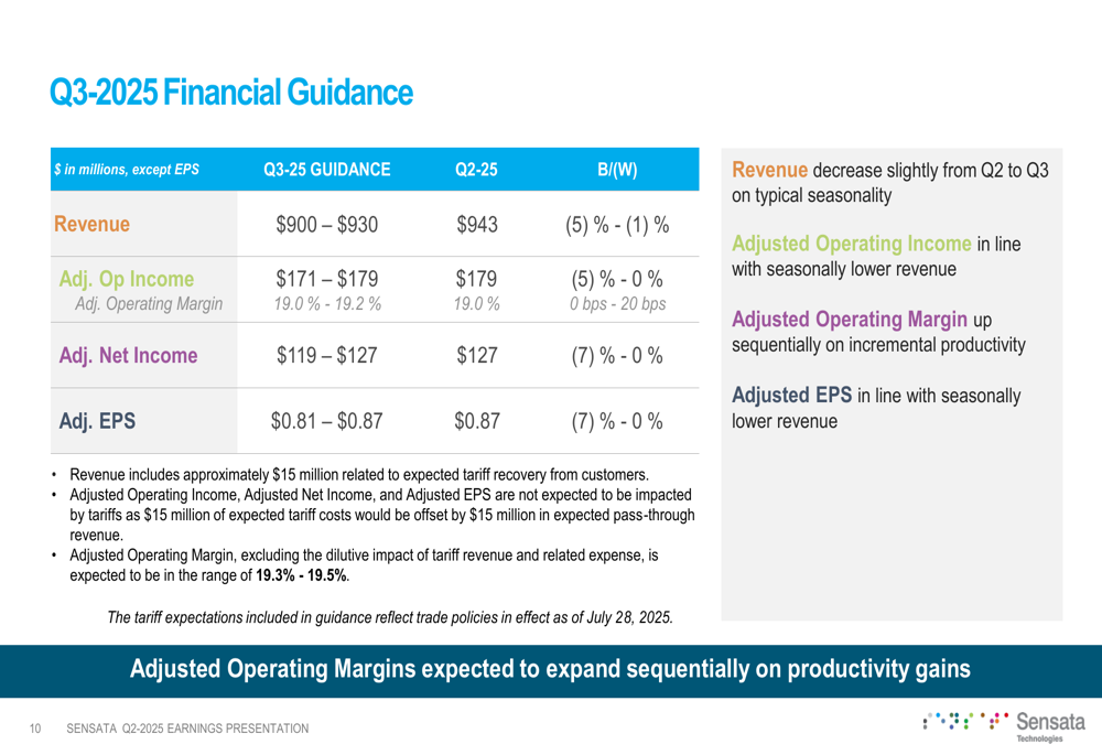 The company noted that its guidance includes approximately $15 million related to expected tariff recovery from customers, reflecting trade policies in effect as of July 28, 2025. Despite the challenging market environment, Sensata expects to maintain margin stability through productivity improvements.