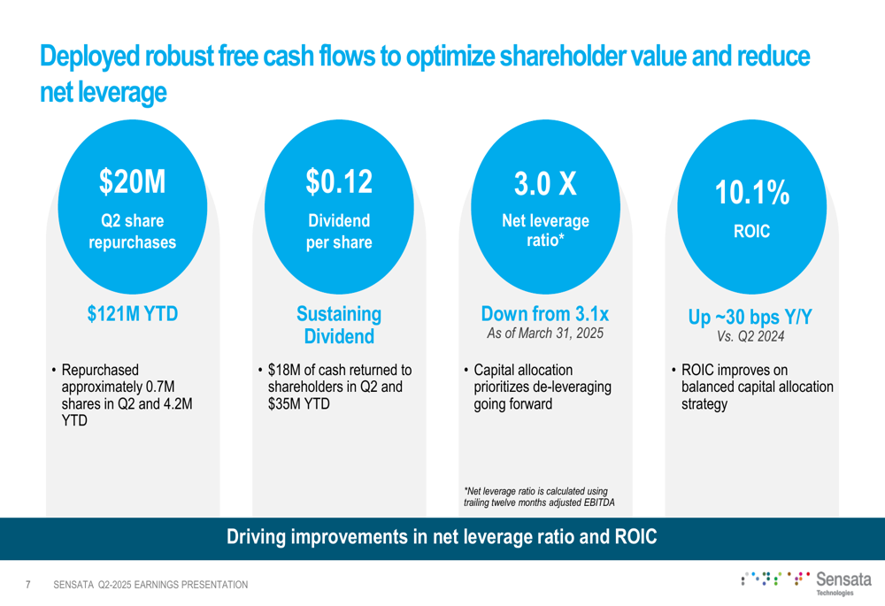 Sensata continued to balance shareholder returns with debt reduction in its capital allocation strategy. During Q2, the company repurchased $20 million worth of shares (approximately 0.7 million shares) and paid a $0.12 per share dividend, returning a total of $18 million to shareholders.