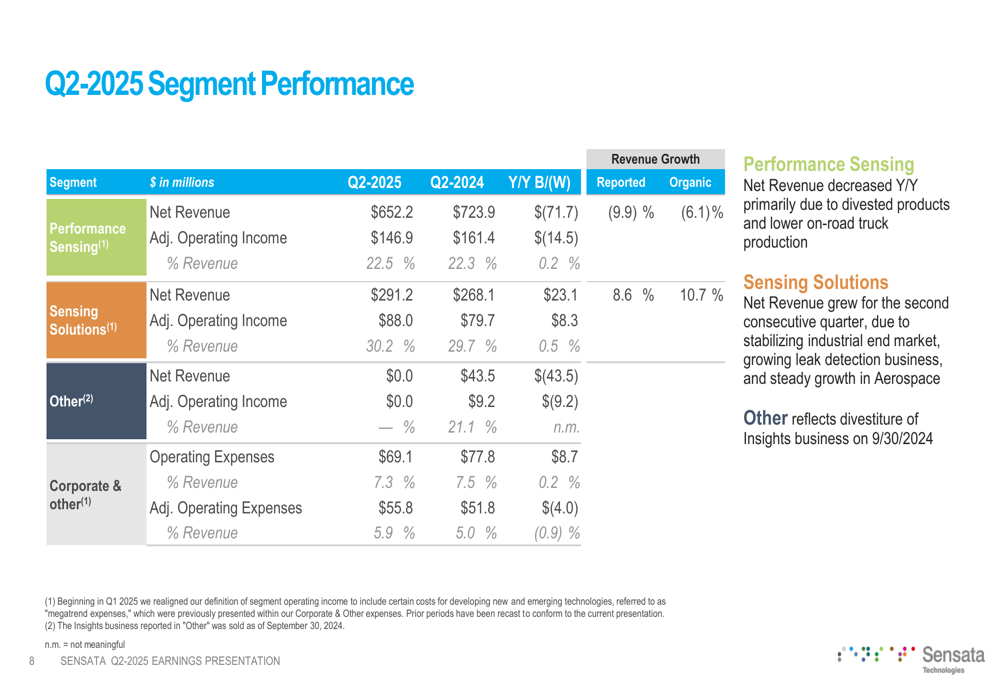 Sensata’s business segments showed divergent performance in Q2 2025. The Performance Sensing segment, which represents approximately 69% of total revenue, experienced a 9.9% year-over-year decline to $652.2 million. This decline was primarily attributed to divested products and lower on-road truck production.