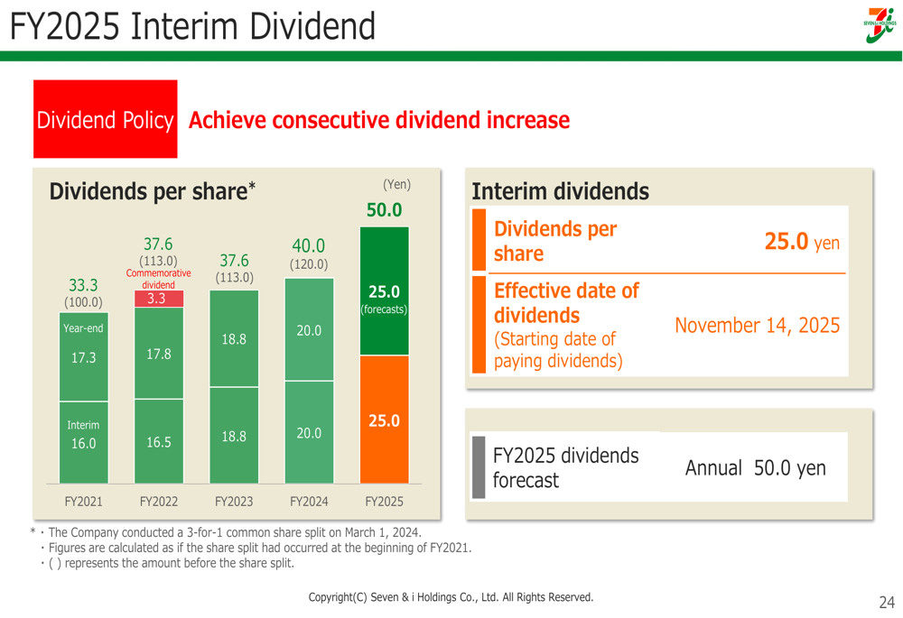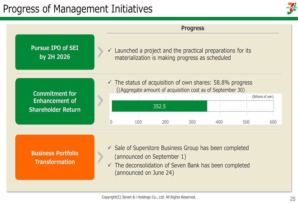 The company also reported progress on its share repurchase program, with 352.5 billion yen already acquired. Additionally, it has completed the sale of its Superstore Business Group (announced on September 1) and the deconsolidation of Seven Bank (announced on June 24).