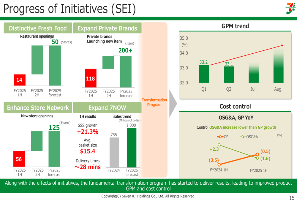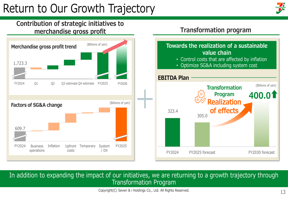 Seven & i Holdings outlined its transformation program aimed at returning to a sustainable growth trajectory. The company is focusing on controlling costs affected by inflation and optimizing SG&A expenses to improve profitability across operations.