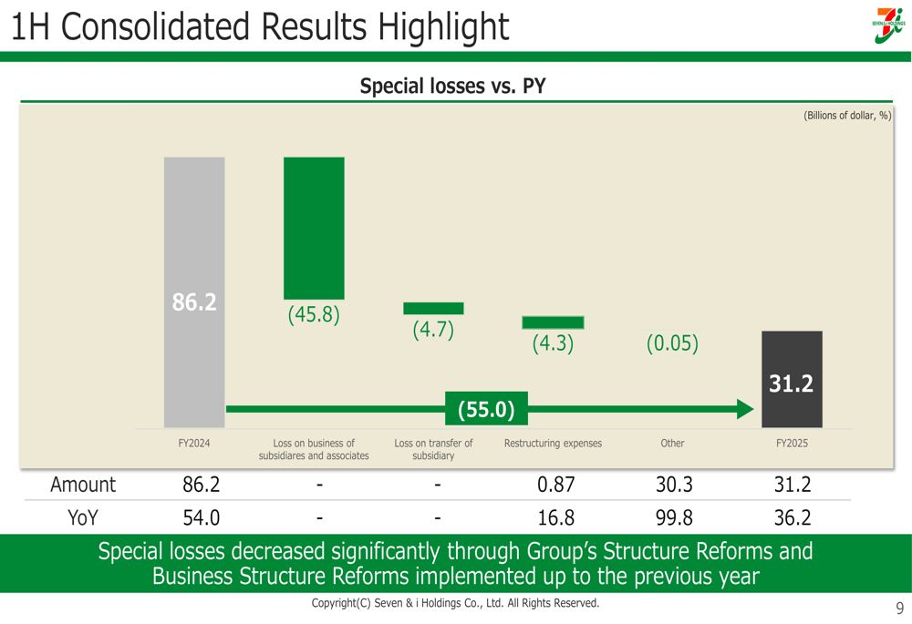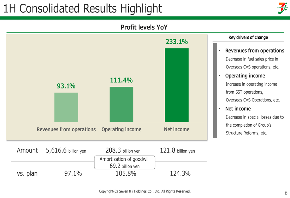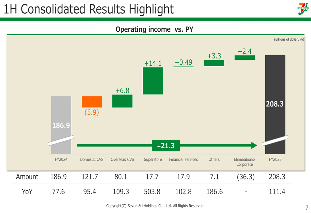 Seven & i Holdings reported operating income of 208.3 billion yen for the first half of FY2025, representing 111.4% year-over-year growth and exceeding the company’s plan by 5.8%. Most notably, net income attributable to owners surged to 121.8 billion yen, a remarkable 233.1% increase compared to the same period last year.