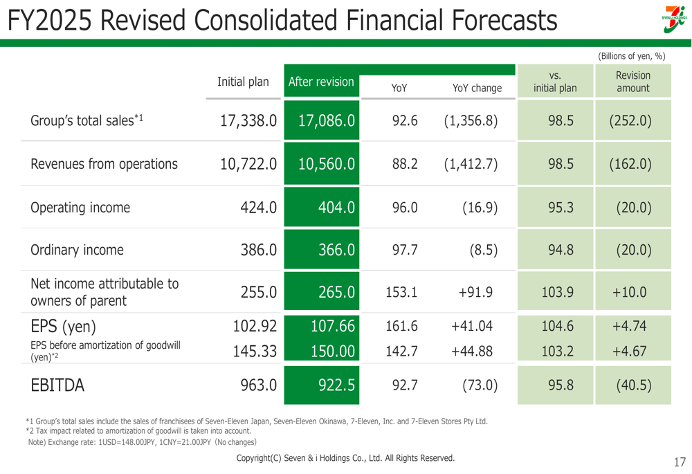Seven & i Holdings revised its full-year financial forecasts, adjusting several key metrics as shown in the following table: