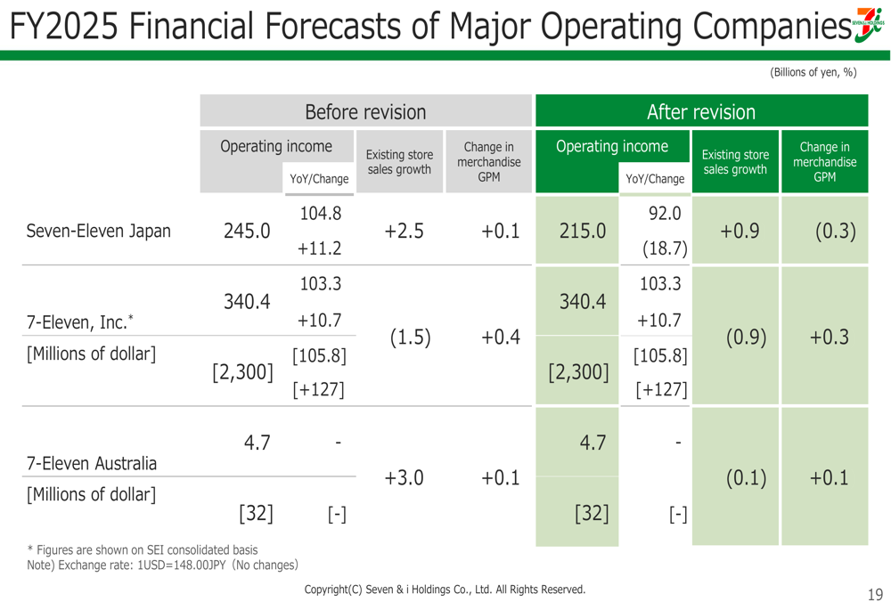 Seven-Eleven Japan’s operating income forecast was maintained at 215.0 billion yen with existing store sales growth projected at 0.9%. Seven-Eleven Inc.’s forecast remained unchanged with a focus on improving merchandise gross profit margin by 0.3%.