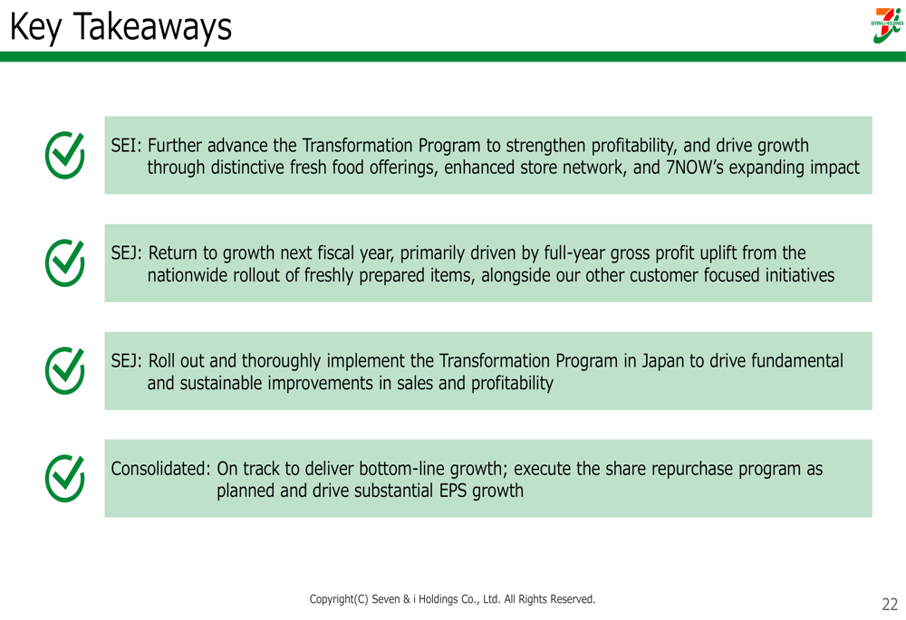 Seven & i Holdings reaffirmed its commitment to several strategic initiatives, including the planned IPO of Seven-Eleven Inc. by the second half of 2026. According to the presentation, practical preparations for this significant corporate event are progressing as scheduled.