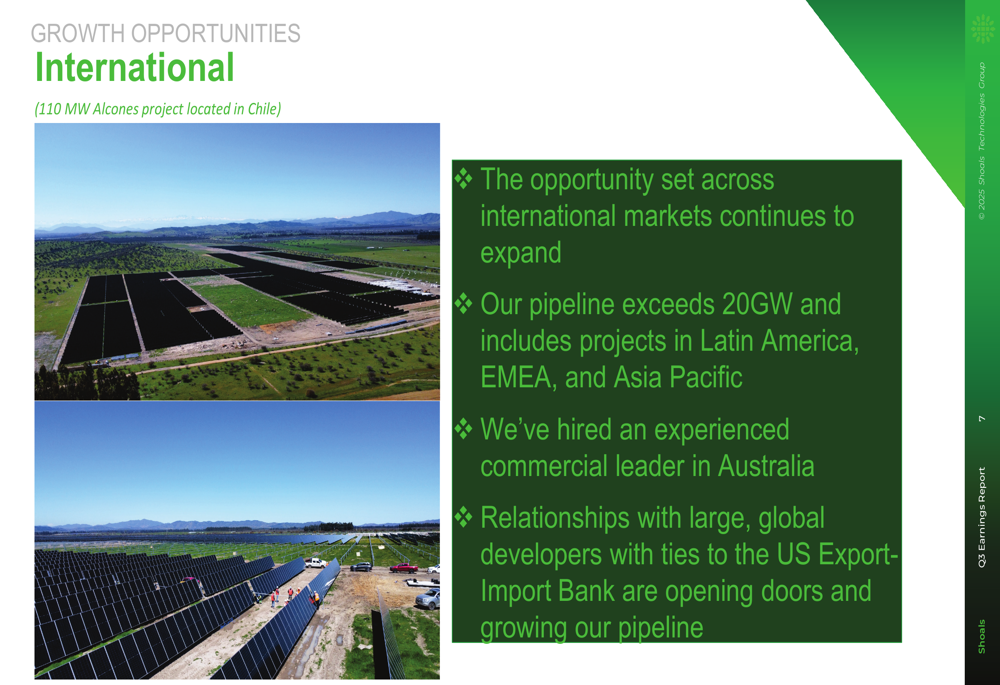 Shoals outlined several strategic growth initiatives aimed at diversifying its revenue streams beyond its core U.S. utility-scale solar market. The company is expanding internationally, with a project pipeline exceeding 20GW across Latin America, EMEA, and Asia Pacific regions. They've hired an experienced commercial leader in Australia and are leveraging relationships with global developers tied to the U.S. Export-Import Bank.
