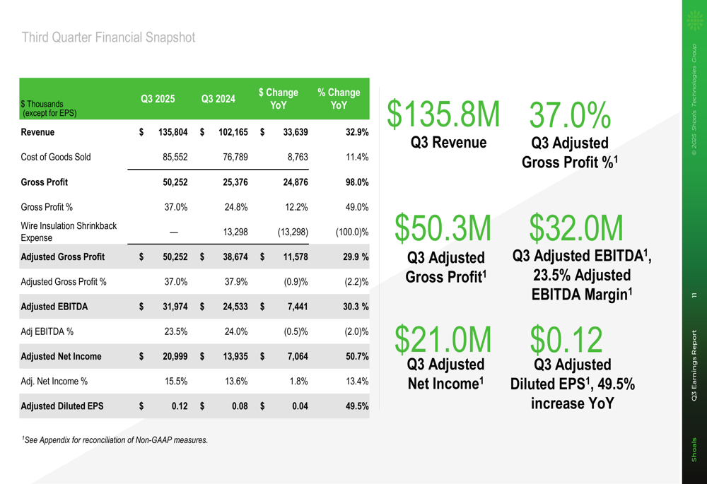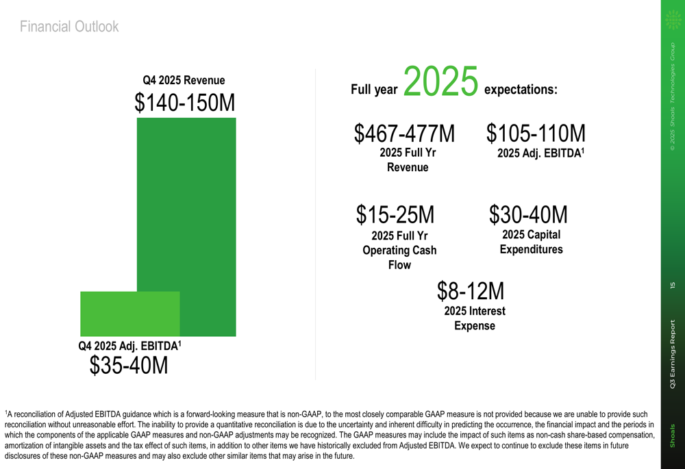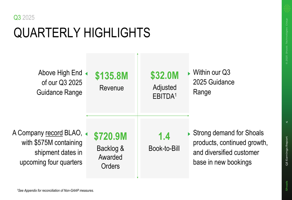 Shoals reported Q3 2025 revenue of $135.8 million, a 32.9% increase year-over-year and exceeding the high end of the company's guidance range. The company achieved an adjusted EBITDA of $32.0 million with a 23.5% margin, within its projected guidance.