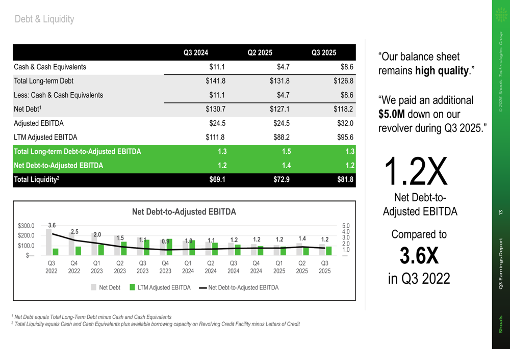 Shoals has also strengthened its balance sheet, reducing its net debt-to-adjusted EBITDA ratio to 1.2x, a significant improvement from 3.6x in Q3 2022. This deleveraging provides greater financial flexibility as the company pursues growth opportunities.