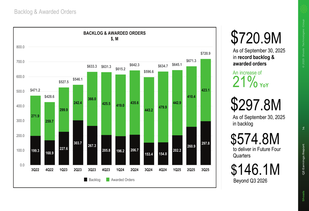The company's backlog and awarded orders reached a record $720.9 million, with $575 million scheduled for delivery in the upcoming four quarters. The book-to-bill ratio of 1.4 indicates strong future demand for Shoals' products.