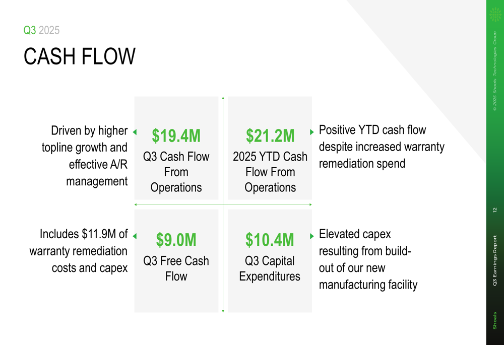 The company's cash flow position showed improvement with Q3 cash flow from operations at $19.4 million and free cash flow at $9.0 million, despite increased warranty remediation spending and elevated capital expenditures related to a new manufacturing facility.