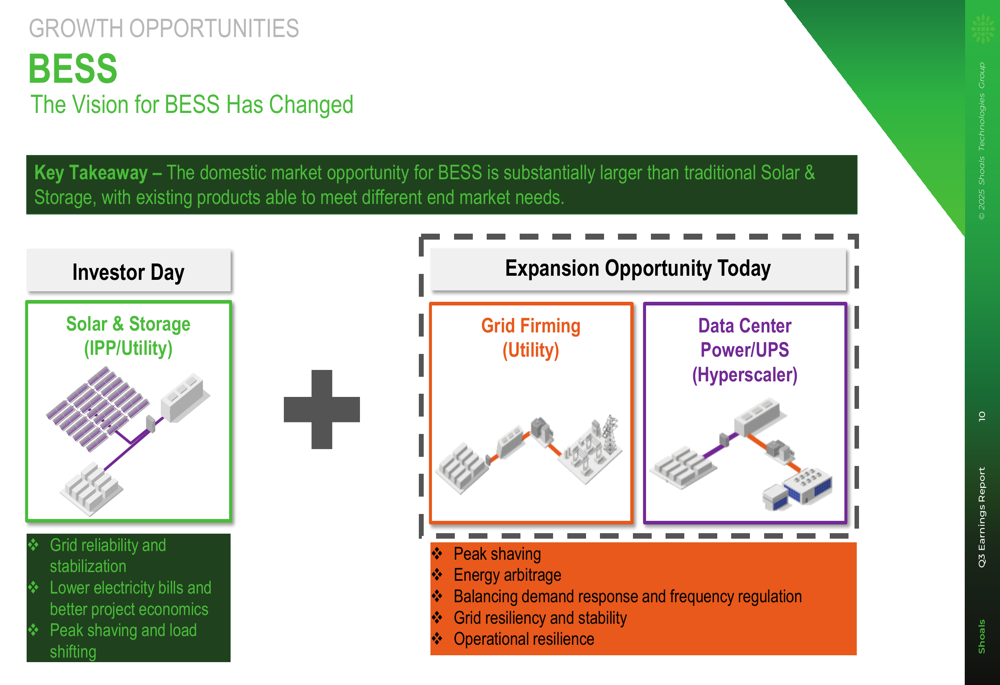 Perhaps most significantly, Shoals is expanding its presence in the Battery Energy Storage Systems (BESS) market, which presents substantial growth opportunities in grid firming for utilities and power solutions for data centers.