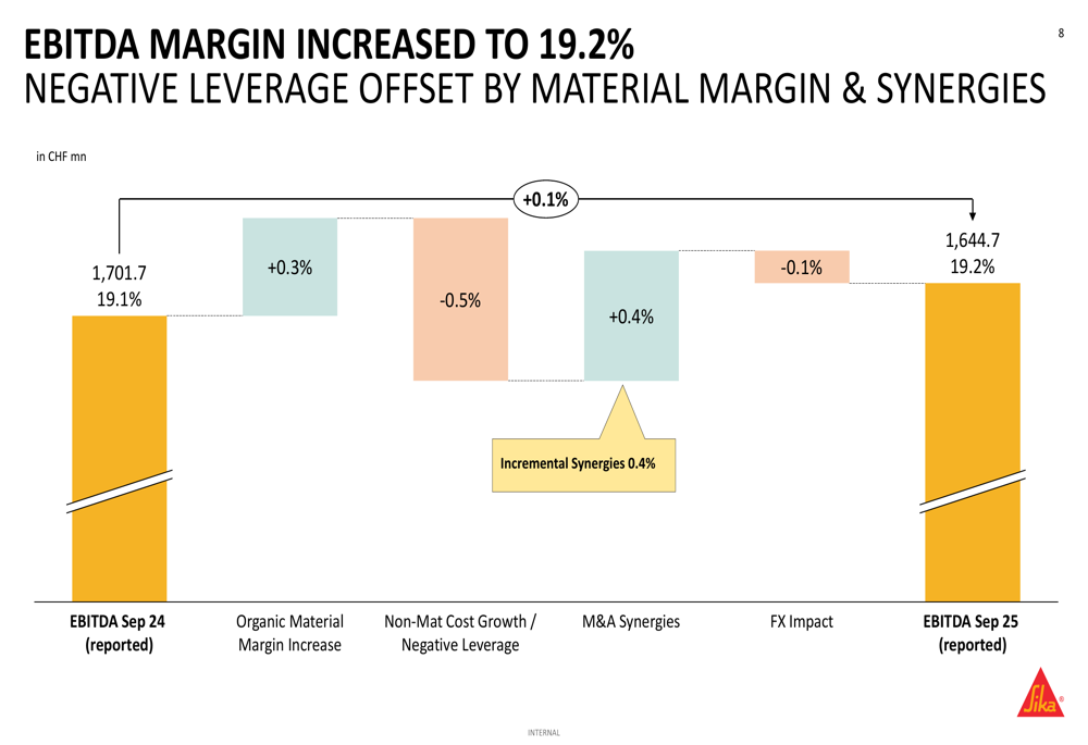 Despite the sales decline in reported terms, Sika achieved margin expansion with its material margin increasing to 55.0% (from 54.7% in the previous year) and EBITDA margin rising to 19.2% (from 19.1%). This margin improvement was achieved despite negative leverage from lower volumes, offset by material margin improvements and synergies from acquisitions.