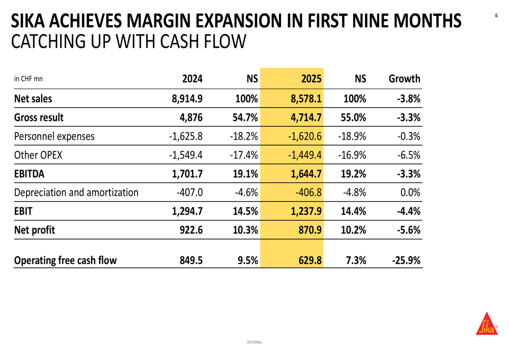 The following table provides a comprehensive overview of Sika’s financial performance for the first nine months of 2025: