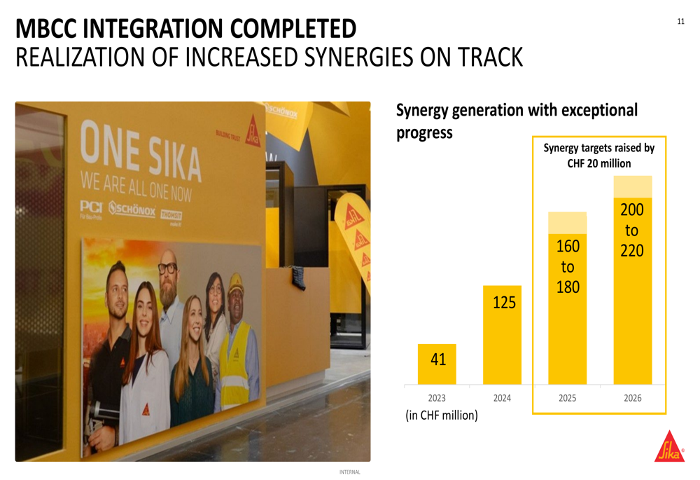 Sika also highlighted the successful completion of the MBCC integration, with synergy realization on track. The company has raised its synergy targets by CHF 20 million, as illustrated in the following chart: