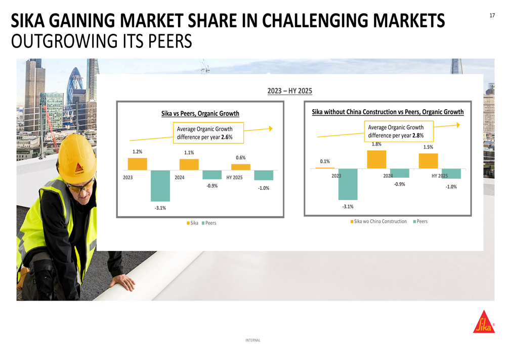 The company highlighted its outperformance against peers, achieving higher organic growth rates over the past several years. Even excluding the impact of China’s construction market, Sika has consistently outgrown its competitors by an average of 2.8% per year.