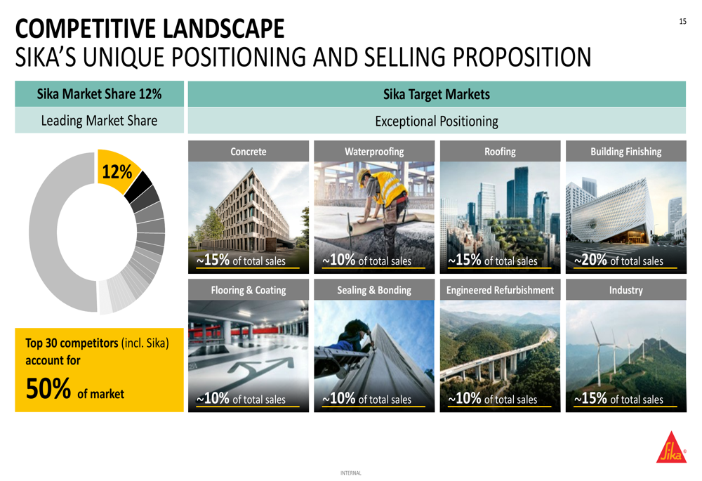 Sika maintains a strong competitive position with 12% market share in its target markets, while the top 30 competitors (including Sika) account for 50% of the market. The company’s diversified portfolio spans across various segments including concrete, waterproofing, roofing, building finishing, flooring, sealing & bonding, refurbishment, and industrial applications.