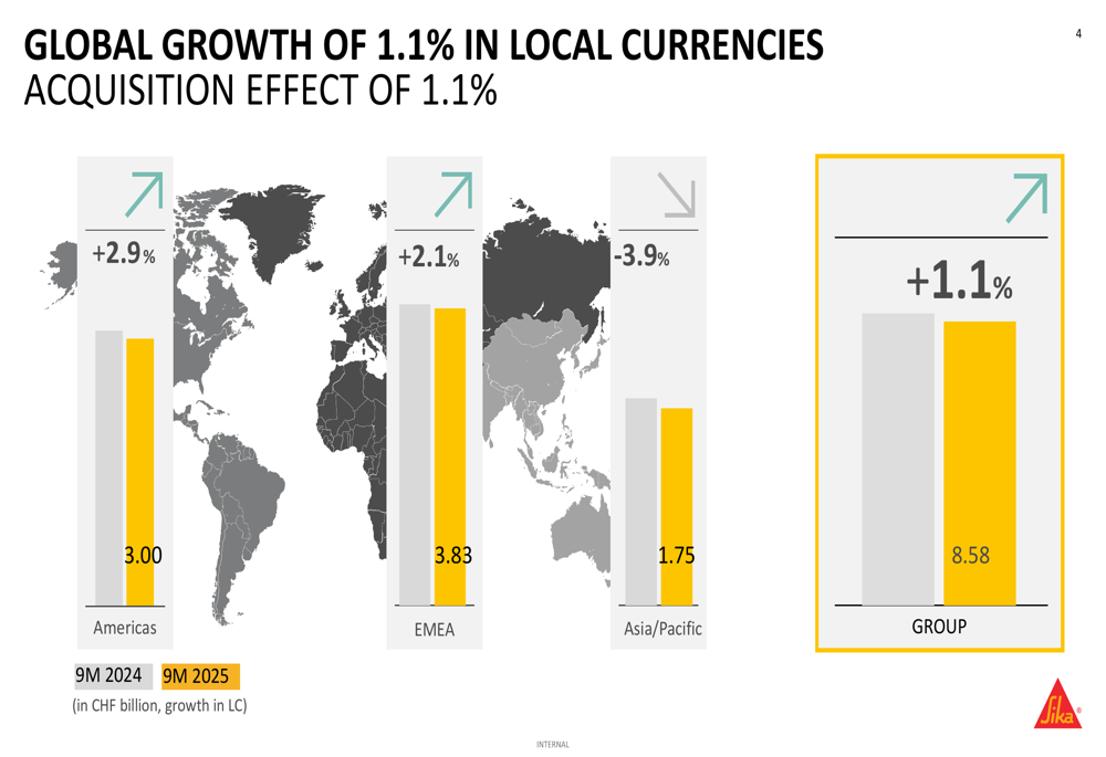 Sika reported a sales increase of 1.1% in local currencies for the first nine months of 2025, with acquisition growth contributing 1.1%. However, reported sales in Swiss francs declined by 3.8% to CHF 8.58 billion due to a significant foreign exchange impact of -4.9%, primarily attributed to the weaker US dollar.