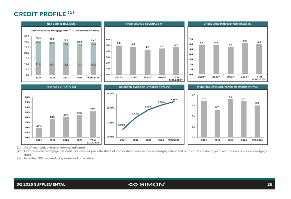 Simon's balance sheet remains robust, with a disciplined approach to leverage and strong credit metrics. The company's credit profile shows healthy fixed charge coverage and interest coverage ratios around 5x, with a weighted average interest rate of approximately 4.0% and a weighted average maturity of about 7 years: