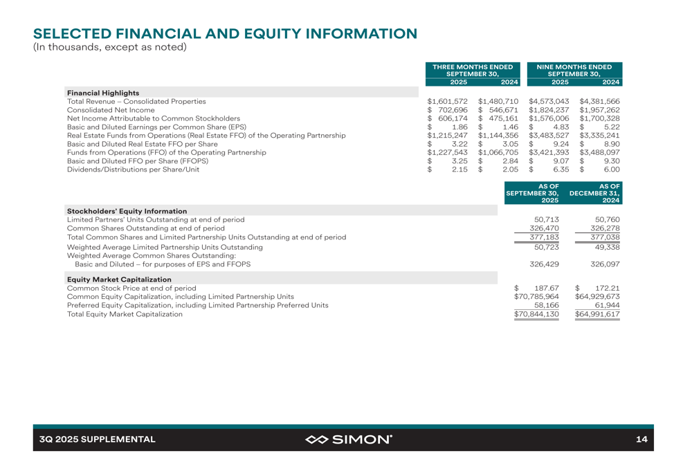 Simon Property Group reported net income attributable to common stockholders of $606.2 million, or $1.86 per diluted share, for the third quarter of 2025. The company's Funds From Operations (FFO) reached $1.228 billion, or $3.25 per diluted share, while Real Estate FFO totaled $1.215 billion, or $3.22 per diluted share.