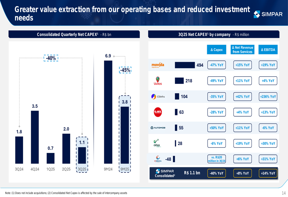 One of the most significant improvements in SIMPAR's financial performance was the 40% reduction in net capital expenditures, which decreased to R$1.1 billion in Q3 2025. This reduction was observed across most of the company's business units, with Movida (-47% YoY) and Vamos (-49% YoY) leading the way.