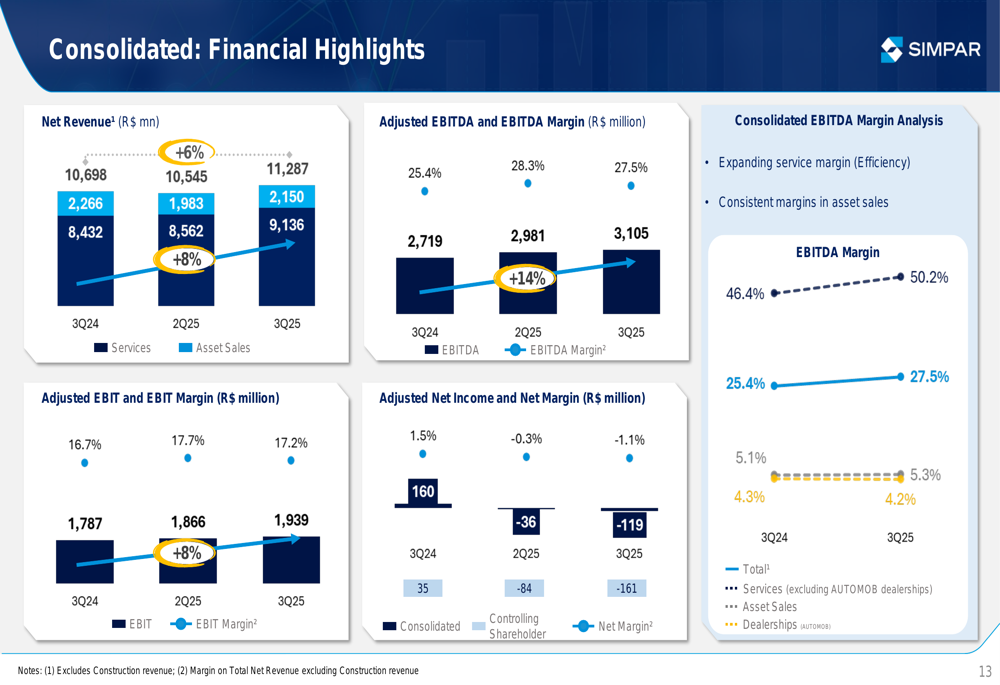 SIMPAR reported total gross revenue of R$12.4 billion in Q3 2025, representing a 5% increase compared to the same period last year. Service revenue, a key component of the business, grew by 8% year-over-year to R$10.2 billion, while sales of heavy assets surged by 82%.