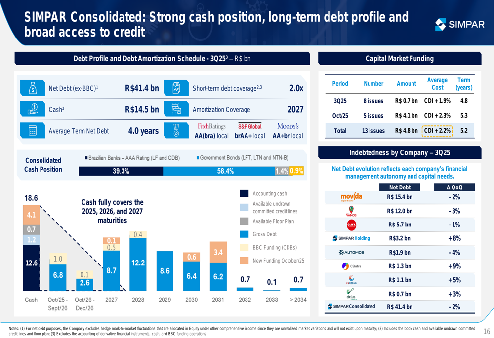 SIMPAR also made progress in strengthening its balance sheet, reducing net debt by approximately R$828 million compared to the previous quarter. The company maintained a strong cash position of R$14.5 billion and extended its debt profile to an average term of 4.0 years.