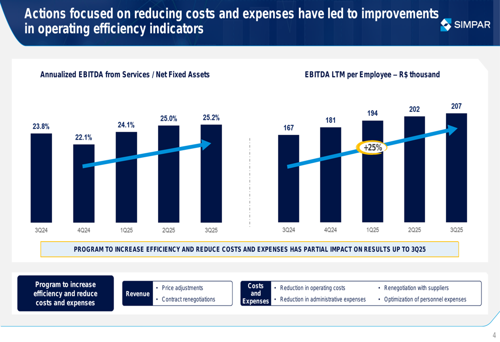 A key focus for SIMPAR has been improving operational efficiency through various cost reduction initiatives. The company reported a 25% increase in EBITDA per employee, which grew from R$167,000 in Q3 2024 to R$207,000 in Q3 2025. Additionally, the ratio of annualized EBITDA from services to net fixed assets improved from 23.8% to 25.2% year-over-year.