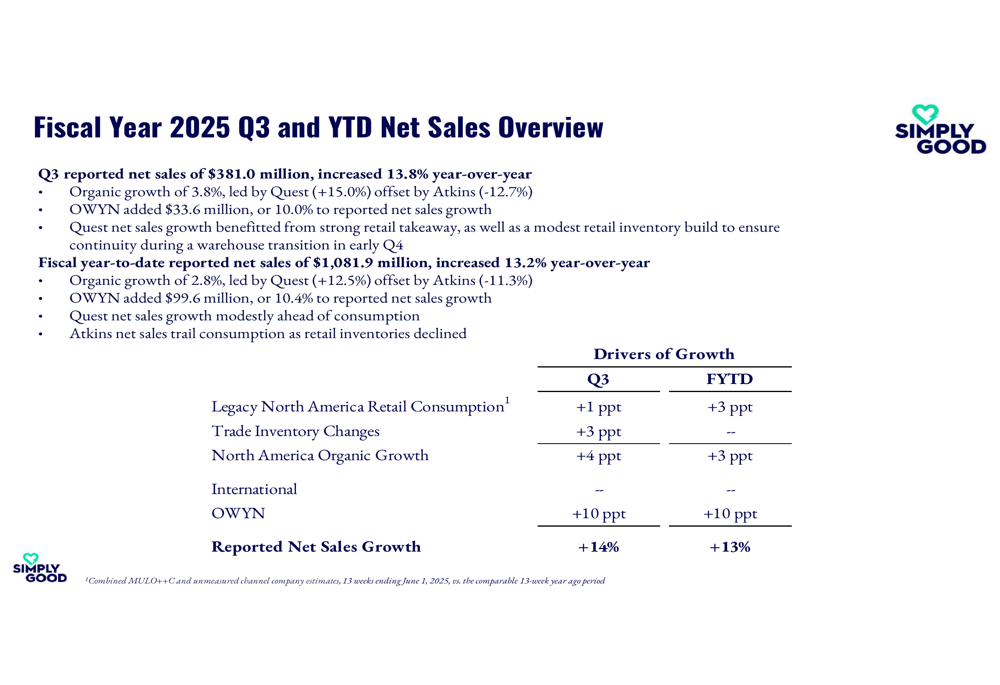 Simply Good Foods reported Q3 net sales of $381.0 million, representing a 13.8% increase year-over-year. This growth was primarily driven by the OWYN acquisition, which contributed 10.0 percentage points to overall growth, while organic growth contributed 3.8%.