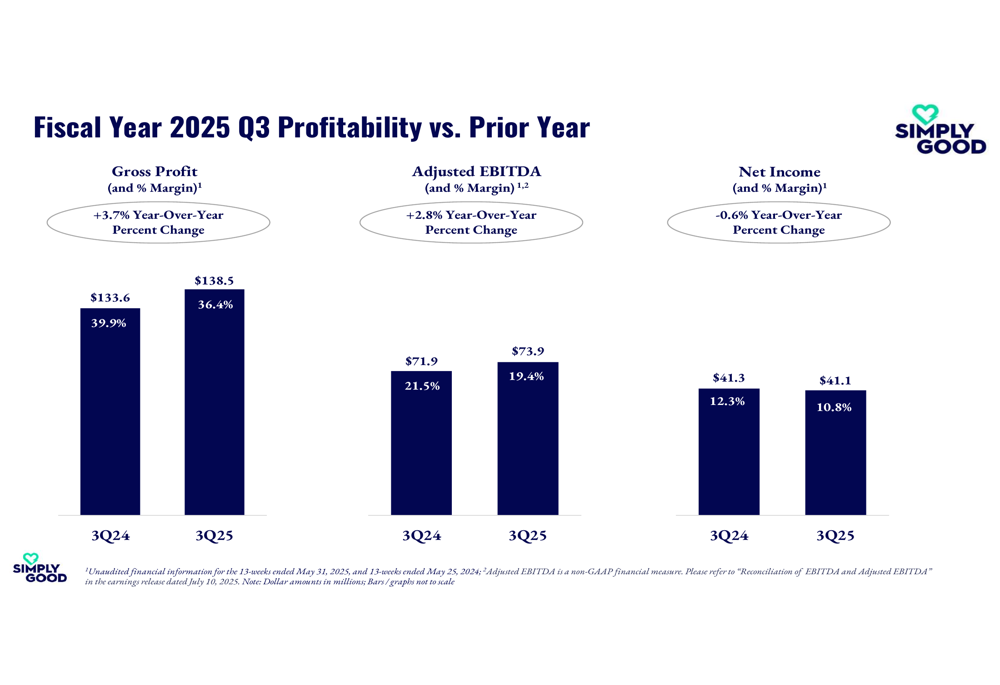 Simply Good Foods’ profitability metrics for Q3 2025 compared to the prior year show the impact of growth investments and margin pressure: