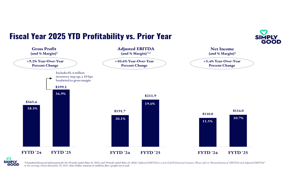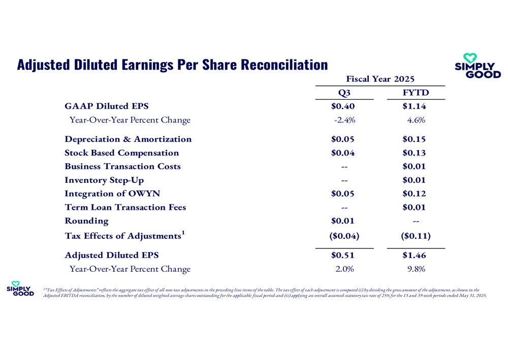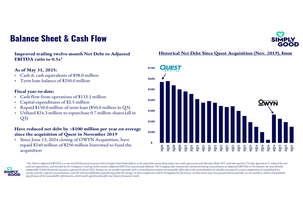 Simply Good Foods continues to demonstrate financial discipline, improving its trailing twelve-month Net Debt to Adjusted EBITDA ratio to 0.5x. As of May 31, 2025, the company had $98.0 million in cash and cash equivalents and a term loan balance of $250.0 million.