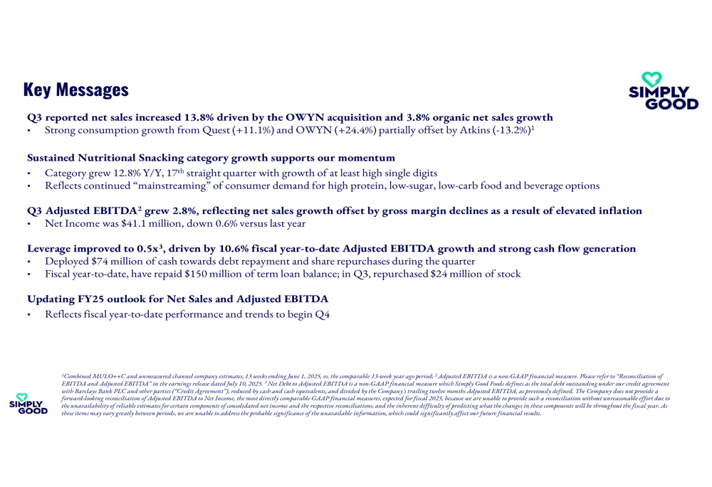 Looking ahead, Simply Good Foods remains confident in its ability to capitalize on the growing nutritional snacking category, with approximately 70% of its portfolio (Quest and OWYN) driving strong top and bottom-line growth. The company plans to continue investing in innovation, expanding physical availability, and broadening awareness of its brands to enable sustainable growth and create shareholder value.