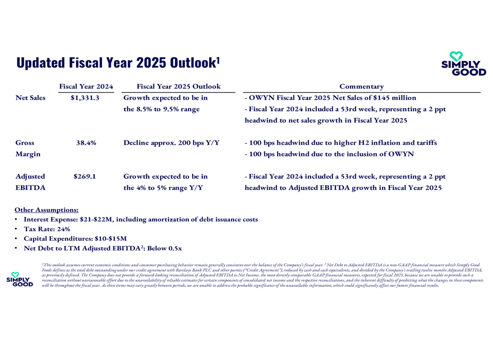 Simply Good Foods updated its fiscal year 2025 outlook, with expectations detailed in the following table: