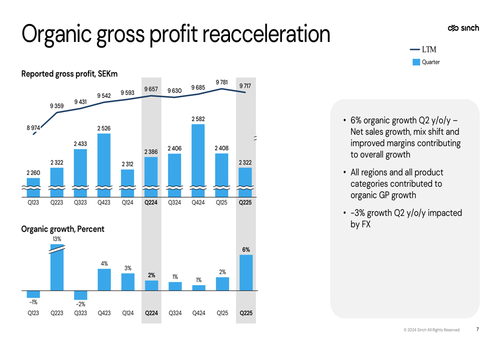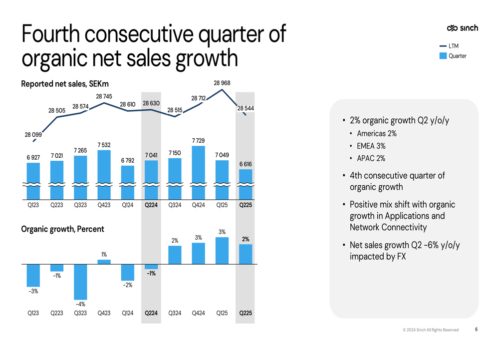 Sinch reported net sales of SEK 6.62 billion in Q2 2025, representing 2% organic growth year-over-year, though reported growth was -6% due to significant foreign exchange translation effects. Gross profit reached SEK 2.32 billion, with 6% organic growth (-3% reported).