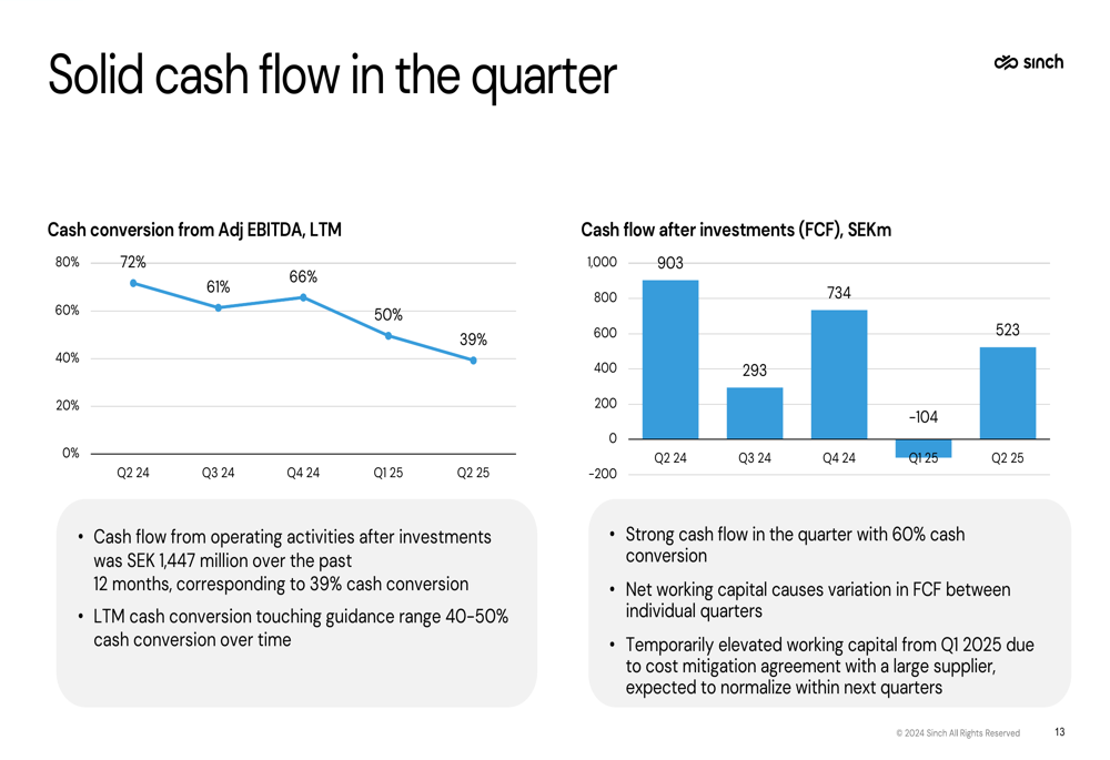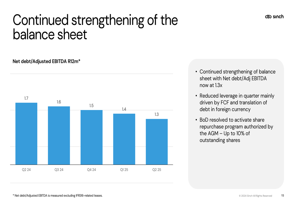 Sinch continued to strengthen its balance sheet, with the net debt to adjusted EBITDA ratio improving to 1.3x from 1.7x in Q2 2024. This deleveraging was primarily driven by free cash flow generation and translation of debt in foreign currency.