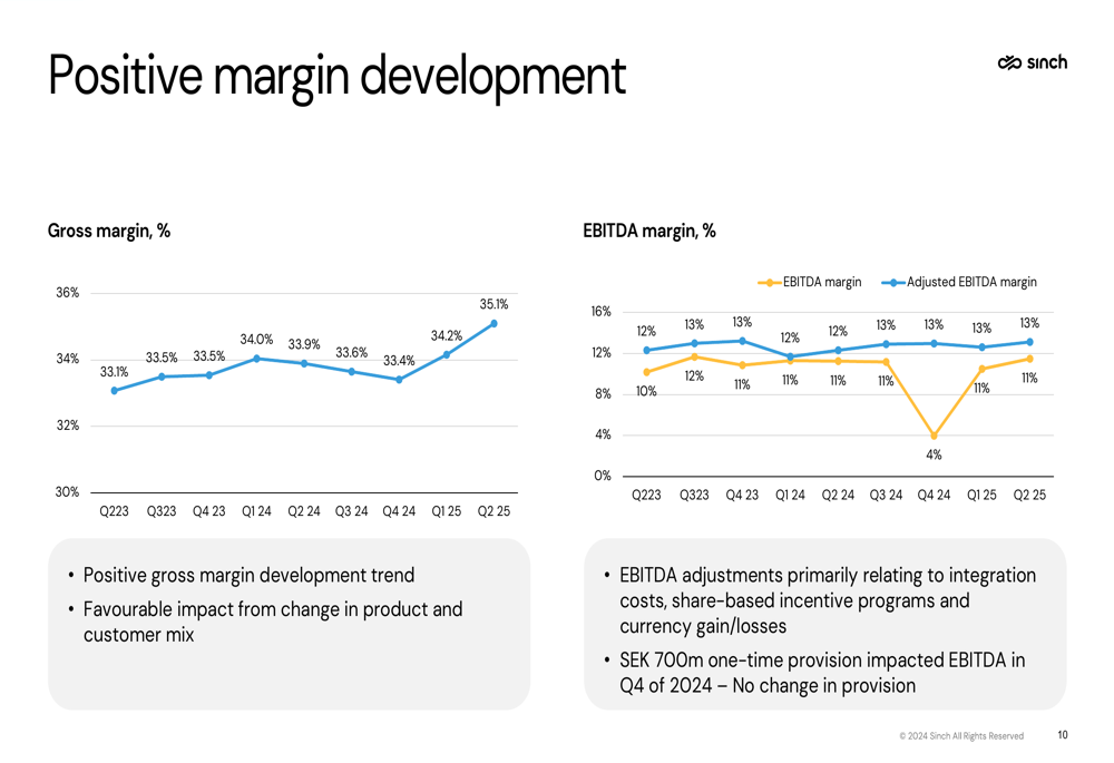 Sinch’s margin improvement continued in Q2 2025, with gross margin reaching 35.1%, up from 33.1% in Q2 2023. This positive trend reflects favorable changes in product and customer mix.