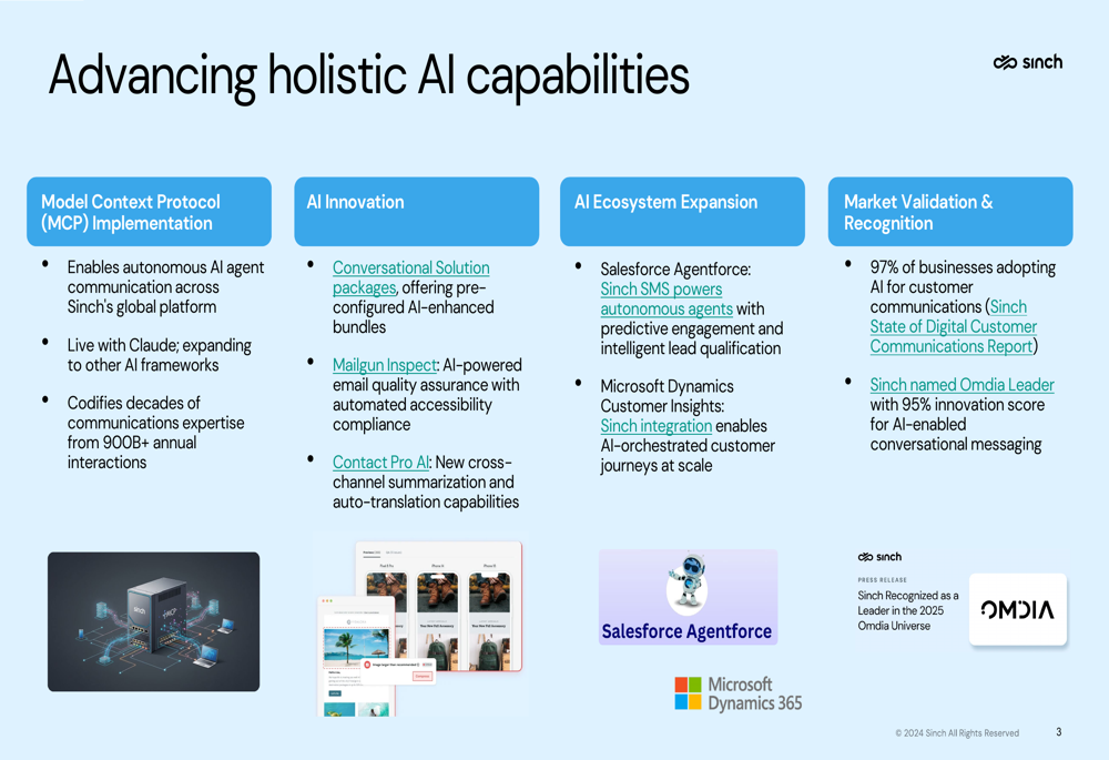 A central theme of Sinch’s Q2 presentation was the company’s focus on AI integration across its product portfolio. CEO Laurinda Pang emphasized that "AI is fundamentally transforming how businesses communicate," highlighting Sinch’s commitment to building "a comprehensive intelligent communications platform" rather than merely adding AI features.