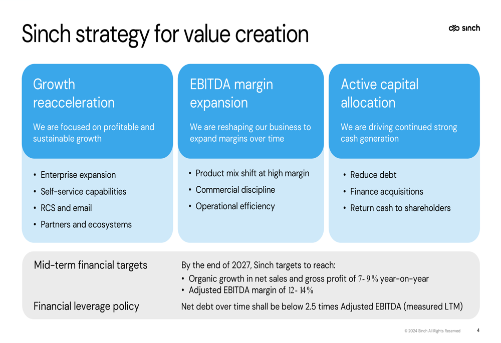 Sinch maintained its mid-term financial targets, aiming to achieve 7-9% organic growth in both net sales and gross profit by the end of 2027. The company also targets an adjusted EBITDA margin of 12-14% and intends to maintain net debt below 2.5 times adjusted EBITDA.